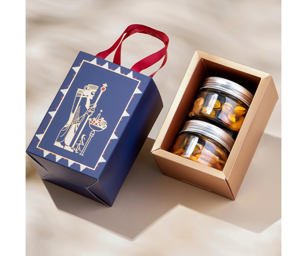 آجیل چهار مغز نیز از جمله محصولاتی است که در این باکس نوروزی قرار دارد. این آجیل شامل گردو، بادام، پسته و فندق است و با بستهبندی زیبا و شیشهای در باکس هدیه نوروزی قرار گرفته است. این آجیل به دلیل مزهی خوشایند و خواص مفید آنها، برای بسیاری از افراد یکی از هدایای پرطرفدار در این روزها است.