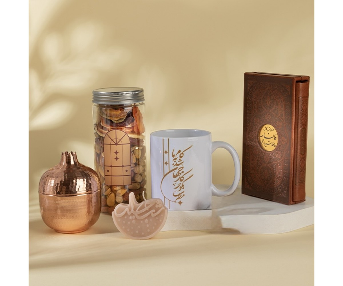 همانطور که از اسمش پیدا است، این محصول خیلی لاکچری و خوشگل است. محتویات درون پک یلدایی آریا مهر نشان از هدیه شب یلدا دارد. در واقع فال حافظی که در باکس وجود دارد یا قندان مسی انار شکل برای هدیه شب یلدا بسیار مناسب است. اگر بخواهیم به طور جزئی تر به محتویات درون باکس توجه کنیم، فال حافظ با جلد چرم کشویی در وسط باکس قرار گرفته و در یک طرف آن شیشه بزرگ پر از آجیل و میوه خشک وجود دارد. در طرف دیگر ماگ سفید رنگ تزیین شده با اشعار و قندان مسی درب اناری دیده می شود. البته درون قندان را با شکلات پر کرده ایم که فرد پس از باز کردن قندان هیجان زده شود. این محصول دو آیتم بامزه هم دارد که یکیش کوکی طرح انار و دیگری شمع طرح یلدا است. ترکیب این محصولات کنار هم موجب منحصر به فرد شدن پک یلدایی می شود.